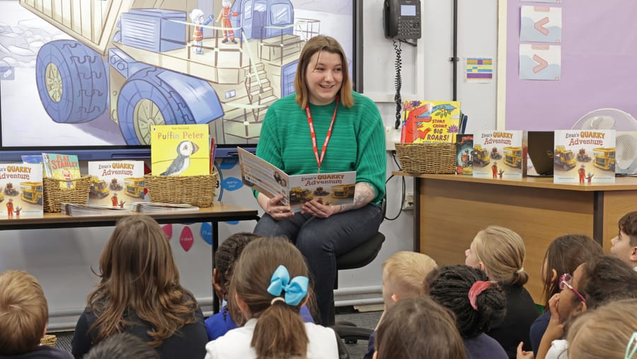 Emily Stevenson reading her winning story Ewan’s Quarry Adventure to children at Leighton Primary, Peterborough.