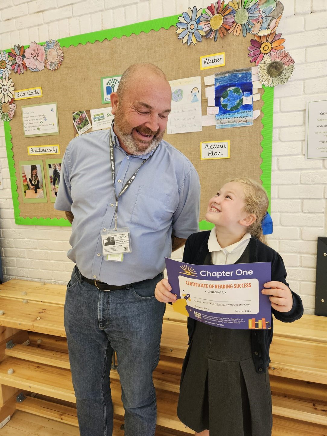 Photo below: Heidelberg Materials UK volunteer Mark Roberts meeting his pupil and presenting her with her certificate at the end-of-year reading celebration in July 2024.