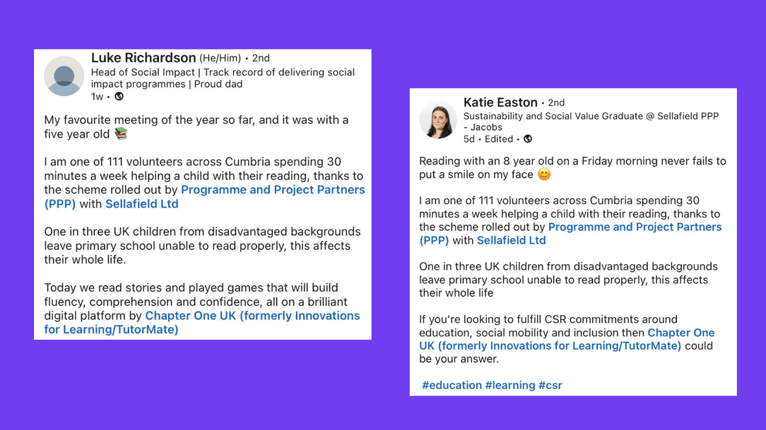 As part of this commitment, PPP wanted to support children and schools within the area. However, with many of the Sellafield partner companies being located outside West Cumbria, getting volunteers into schools was going to be a challenge. This is where Chapter One’s digital, remote volunteer reading platform came into its own - enabling those companies with staff outside the region to tackle the literacy issue locally.