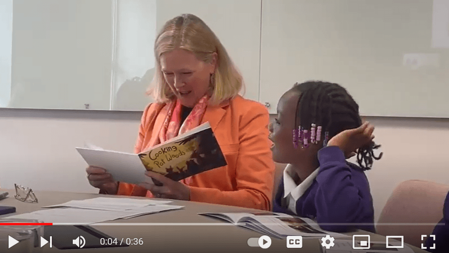 Jean Renton, CFO for Sodexo UK & Ireland, reading aloud the winning book Cooking Pot Woods to the visiting children from Galleywall Primary School, Southwark